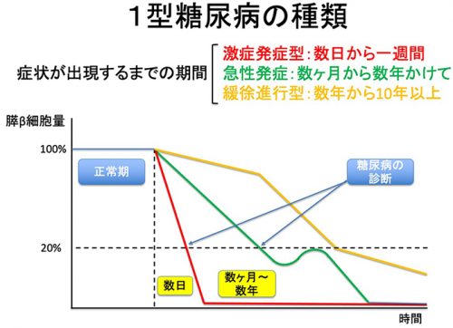 1 型糖尿病を発症すると、自分の体の中でインスリンを作ることが出来なくなってしまいます。インスリンがないと、ブドウ糖を細胞に取り込むことが出来ず、高血糖の状態となってしまいます。ブドウ糖は細胞のエネルギー源として大切なものですが、高血糖状態が続くと、様々な形で血管の壁に溜まり、糖尿病特有の合併症につながります。